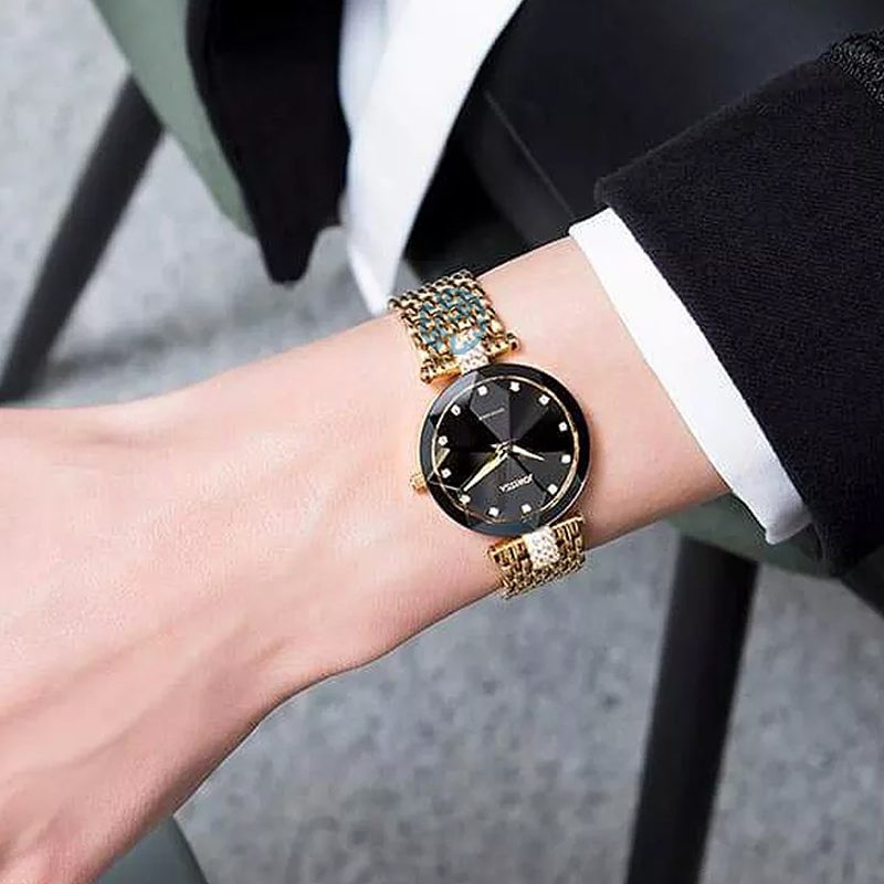 گاهی یک ساعت، فقط ابزار نمایش زمان نیست؛ بلکه بازتابی از سلیقه، روحیه و نگاه شما به زندگی است. ساعت جویسا JW-J5.630.S با ترکیبی هنرمندانه از رنگ طلایی درخشان و مشکی شیک، تصویری از تعادل، قدرت و وقار را بر مچ دست بانوان به تصویر میکشد. درخشش لطیف نگینهای سواروسکی بر صفحه مشکی، به این ساعت، هویت خاصی میبخشد. هر بار که به آن نگاه میکنید، انگار قطعهای از زیبایی ناب سوئیسی را در اختیار دارید.