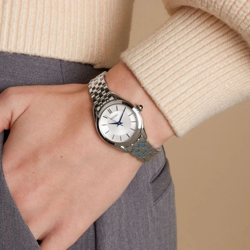 ساعت سیکو SUR537P1 نمونهای موفق از طراحی زنانهای است که هم در موقعیتهای رسمی و هم در استفاده روزمره، جذابیت خود را حفظ میکند. این مدل با بدنه و بندی از استیل ضد حساسیت 316، انتخابی مطمئن برای کسانیست که به دوام و زیبایی ساعت اهمیت میدهند. رنگ نقرهای بدنه در کنار صفحه سفید، جلوهای مینیمال و کلاسیک به ساعت میبخشد.