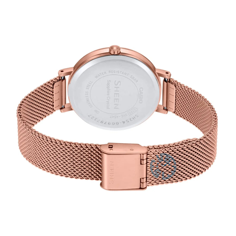 ساعت کاسیو شین SHE-4547PGM-4AUDF از استیل ضد حساسیت 316 برای بدنه و بند استفاده کرده که هم مقاومت بالایی دارد و هم برای پوستهای حساس مناسب است. موتور کوارتز ژاپنی دقت بالا را تضمین میکند و شیشه یاقوت کریستال ضد خش ساعت، از صفحه در برابر خط و خش محافظت میکند. این ساعت زنانه با مقاومت ۵۰ متری در برابر آب، گزینه مناسبی برای استفاده روزانه حتی در شرایط مرطوب است.